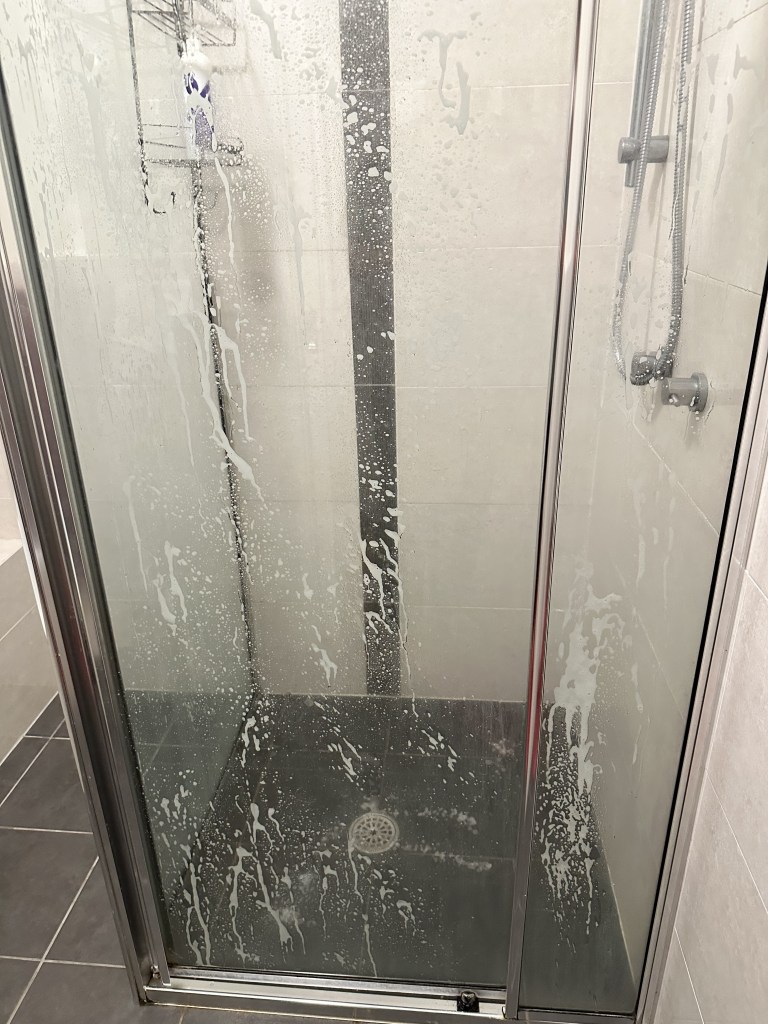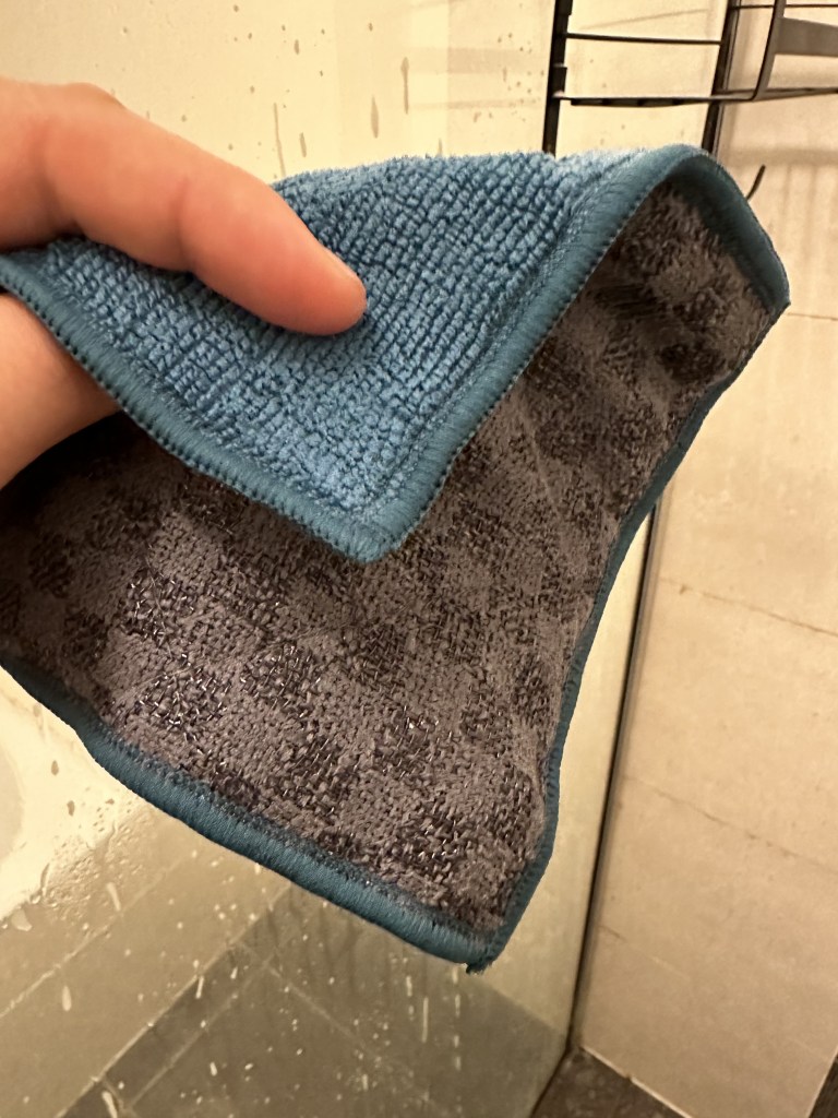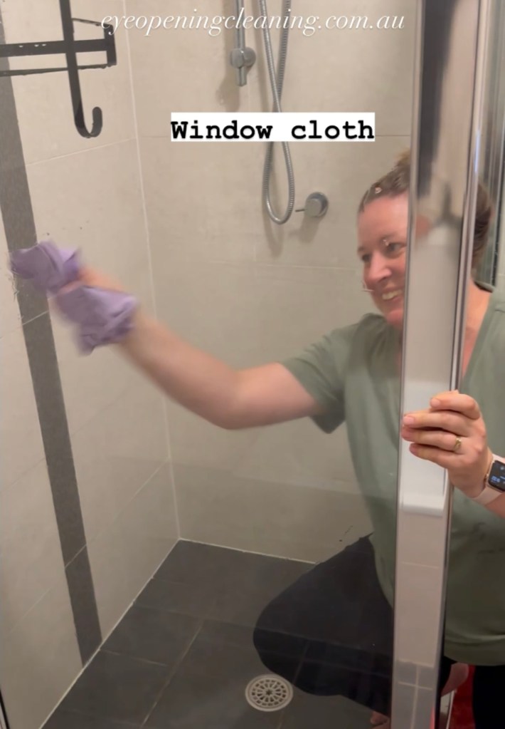For the shower, I use the window cloth to polish everything off. In the bathroom- I use it to polish up mirrors and taps.